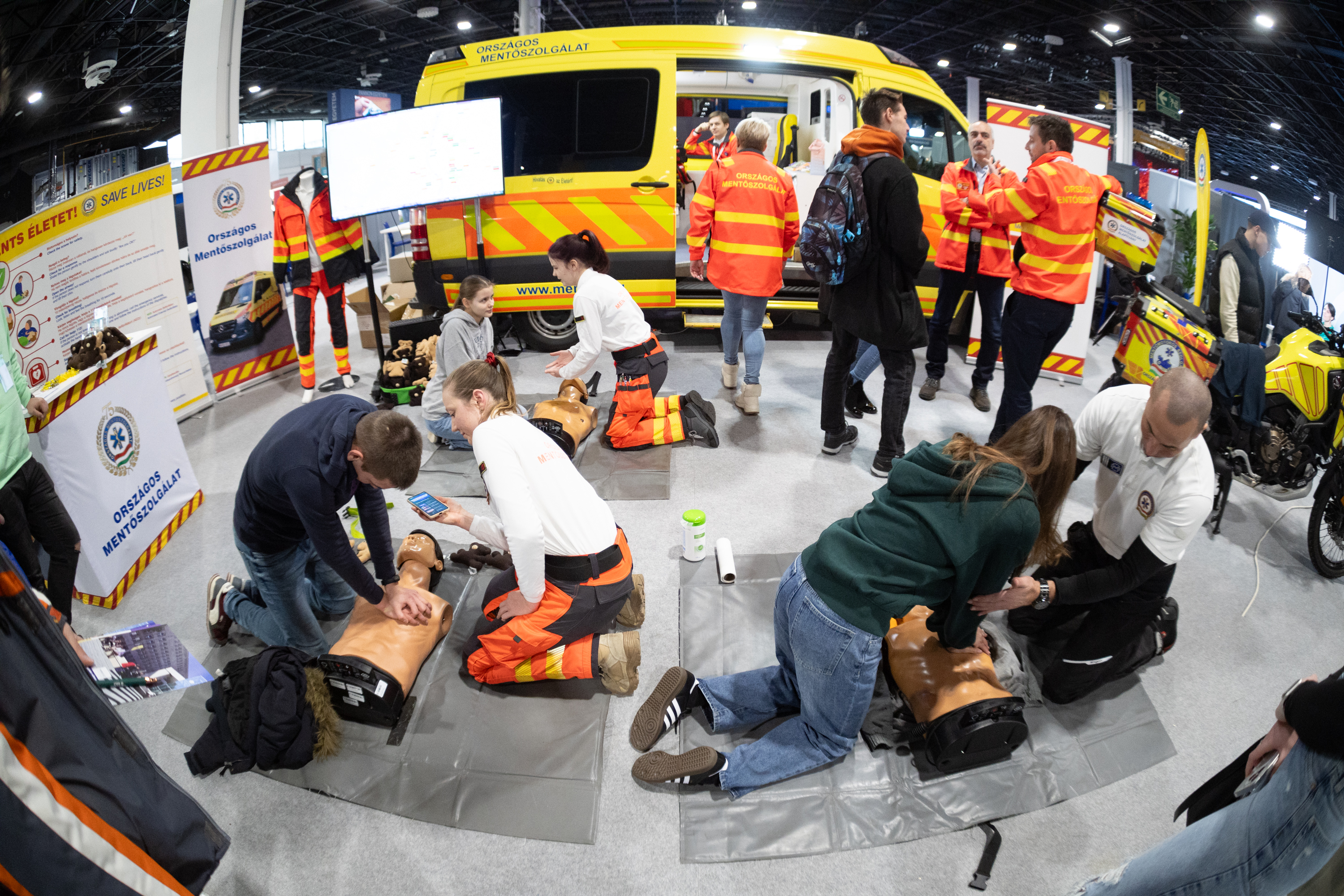Rendkívüli érdeklődés övezte az Országos Mentőszolgálat által kiállított mentőautót és mentőmotort, a szakemberek bárkit megtanítottak az újraélesztés fortélyaira, az esetbemutatók pedig igazán látványos részei voltak a kiállításnak.